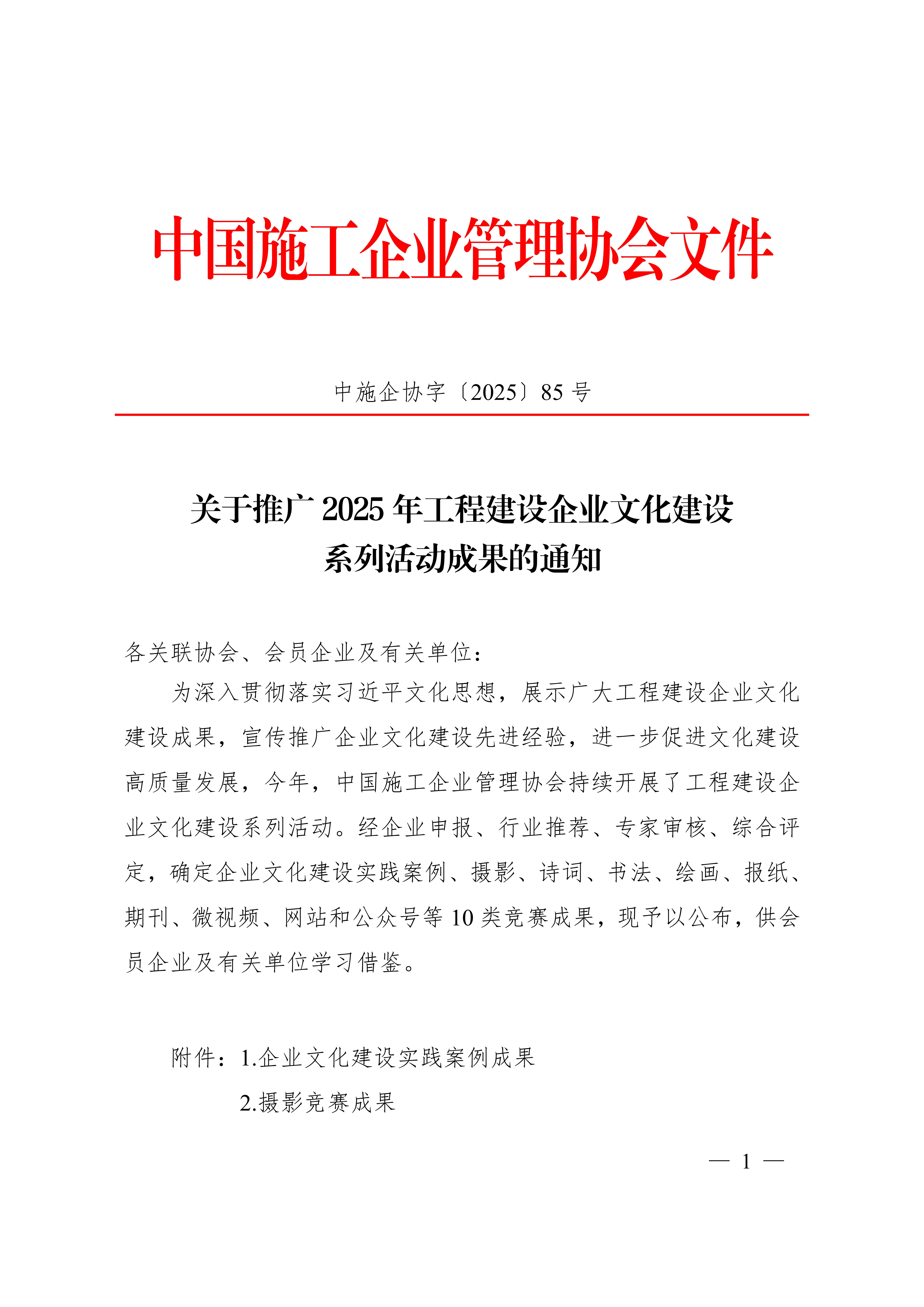 近日,中國(guó)施工企業(yè)管理協(xié)會(huì)印發(fā)《關(guān)于推廣2025年工程建設(shè)企業(yè)文化建設(shè)系列活動(dòng)成果的通知》,公司《機(jī)安通訊》獲報(bào)紙競(jìng)賽二等成果,《...